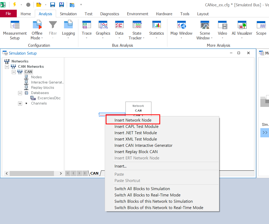 - 첫 화면 파란 블록을 오른쪽 마우스로 클릭 => Insert Network Node 클릭 => 새로운 ECU가 추가된걸 확인할 수 있음