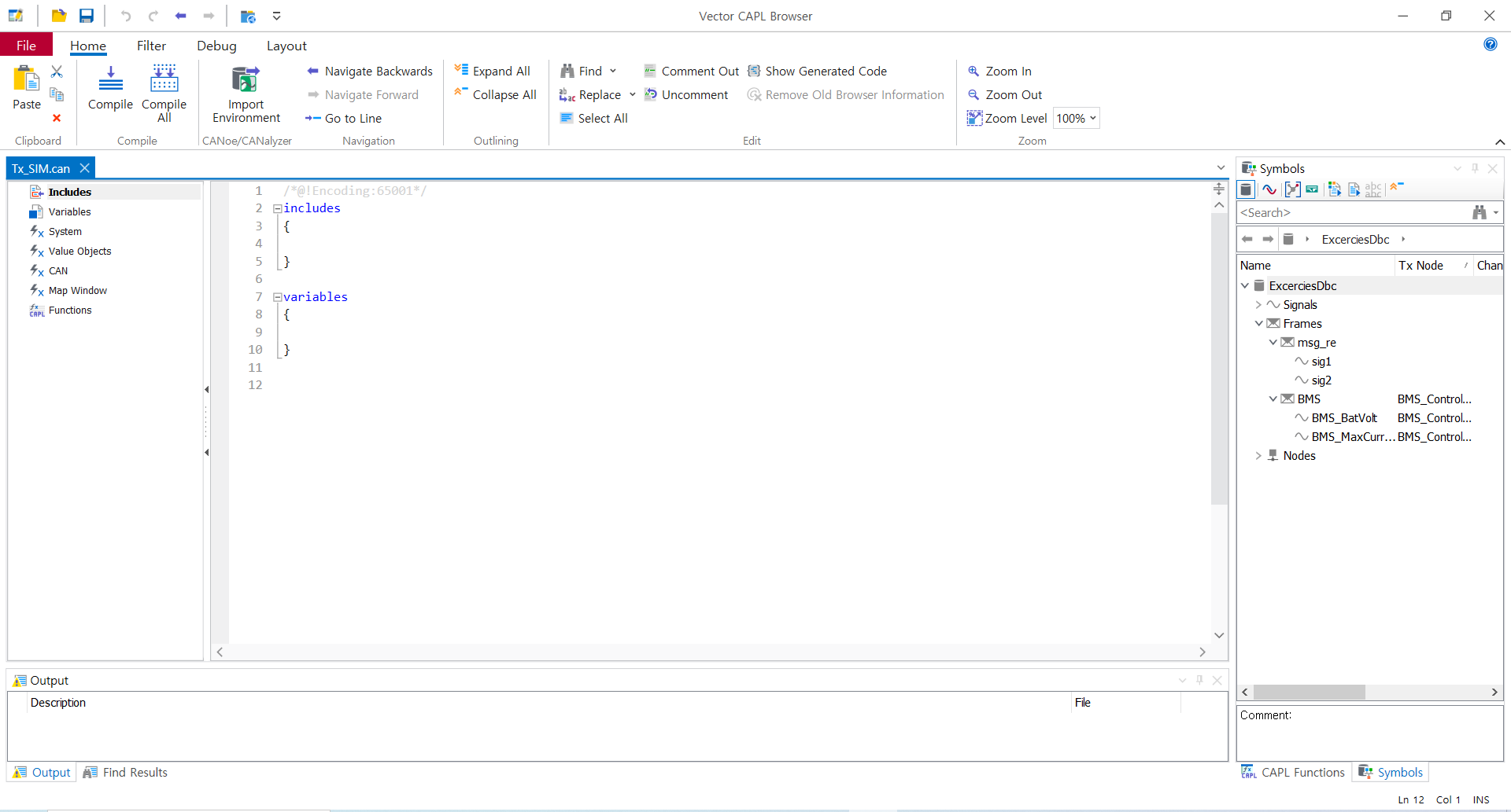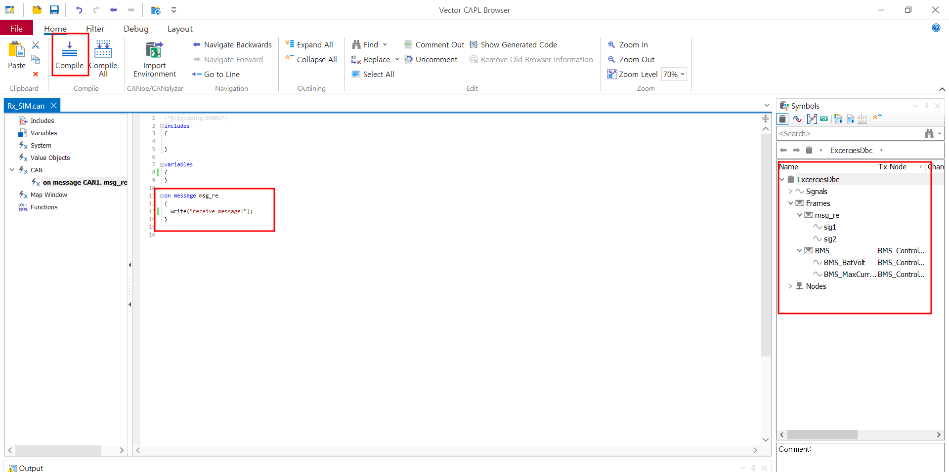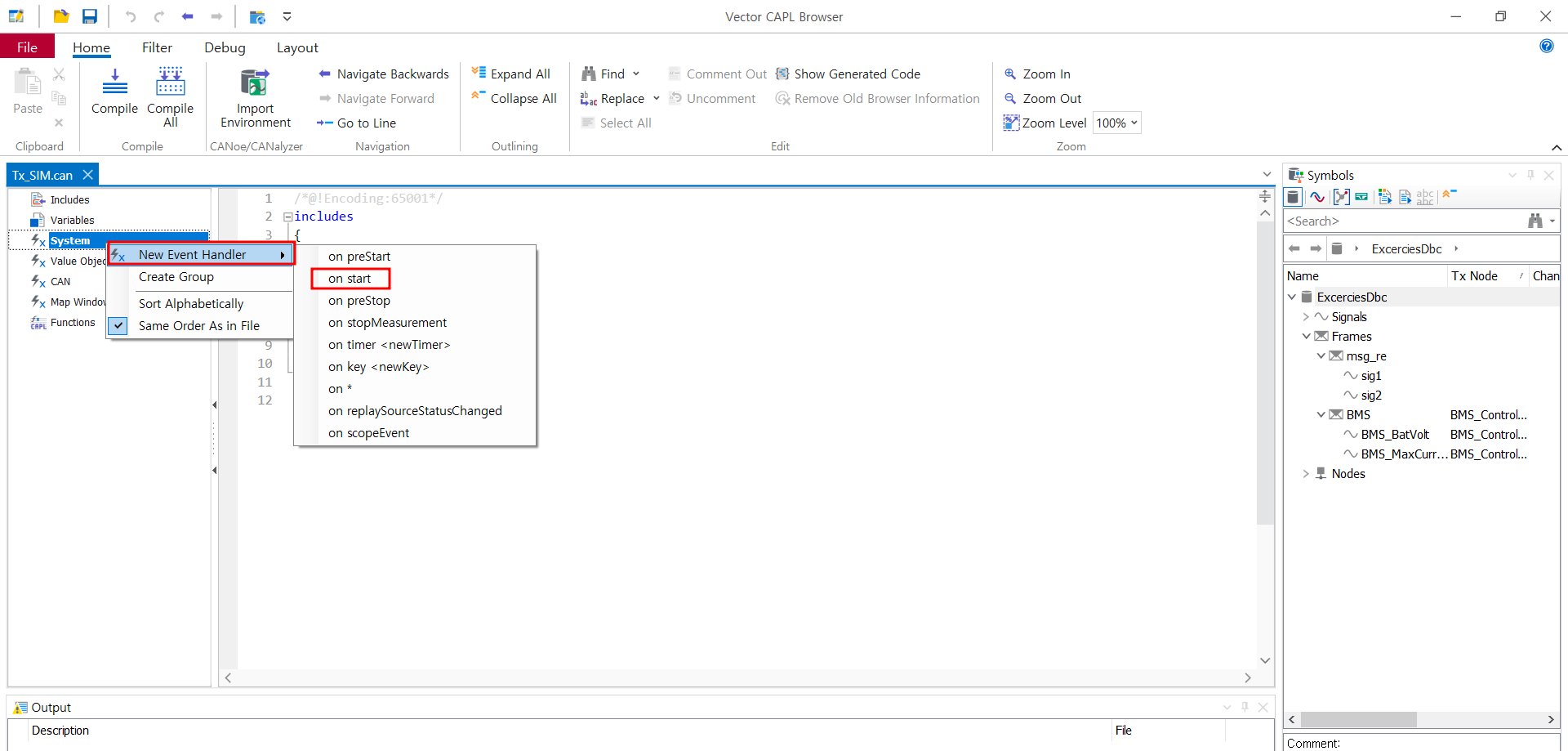 - CAPL창 오른쪽 window에 dbc에 정의된 msg가 있는데, 이걸 CAPL window에 drag & drop하면 해당 msg 변수가 선언됨